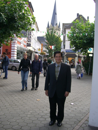 Cedee B. Neo of DHM USA standing on the cobblestones of the City of Sauerland, Germany. Behind is the tower of an old Saint Vincenz Church built in the year 870. |